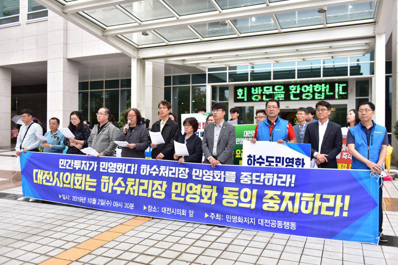 대전시의회가 하수처리장 민영화 동의안을 졸속, 강행처리하는 의결과정에 놀라움과 분노를 금할 수가 없다. 토론조차 없이 대전시장의 민영화 추진에 거수기로 전락해버린 시의원의 직무유기에 분명한 책임을 물을 것이다.
