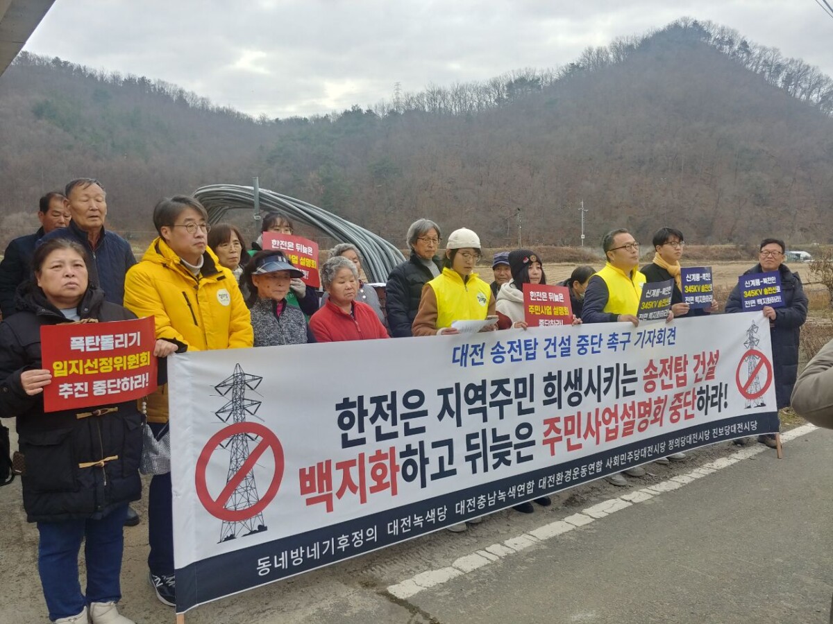 한국전력공사는 대전 서구와 유성구를 관통하는 신계룡–북천안 345kV 송전선로 건설과 주민설명회를 졸속과 기만으로 강행하고 있다. 이번 설명회는 주민을 위한 자리가 아니라, 이미 정해진 결론을 통보하고 책임을 주민에게 떠넘기기 위한 요식행위에 불과하다.