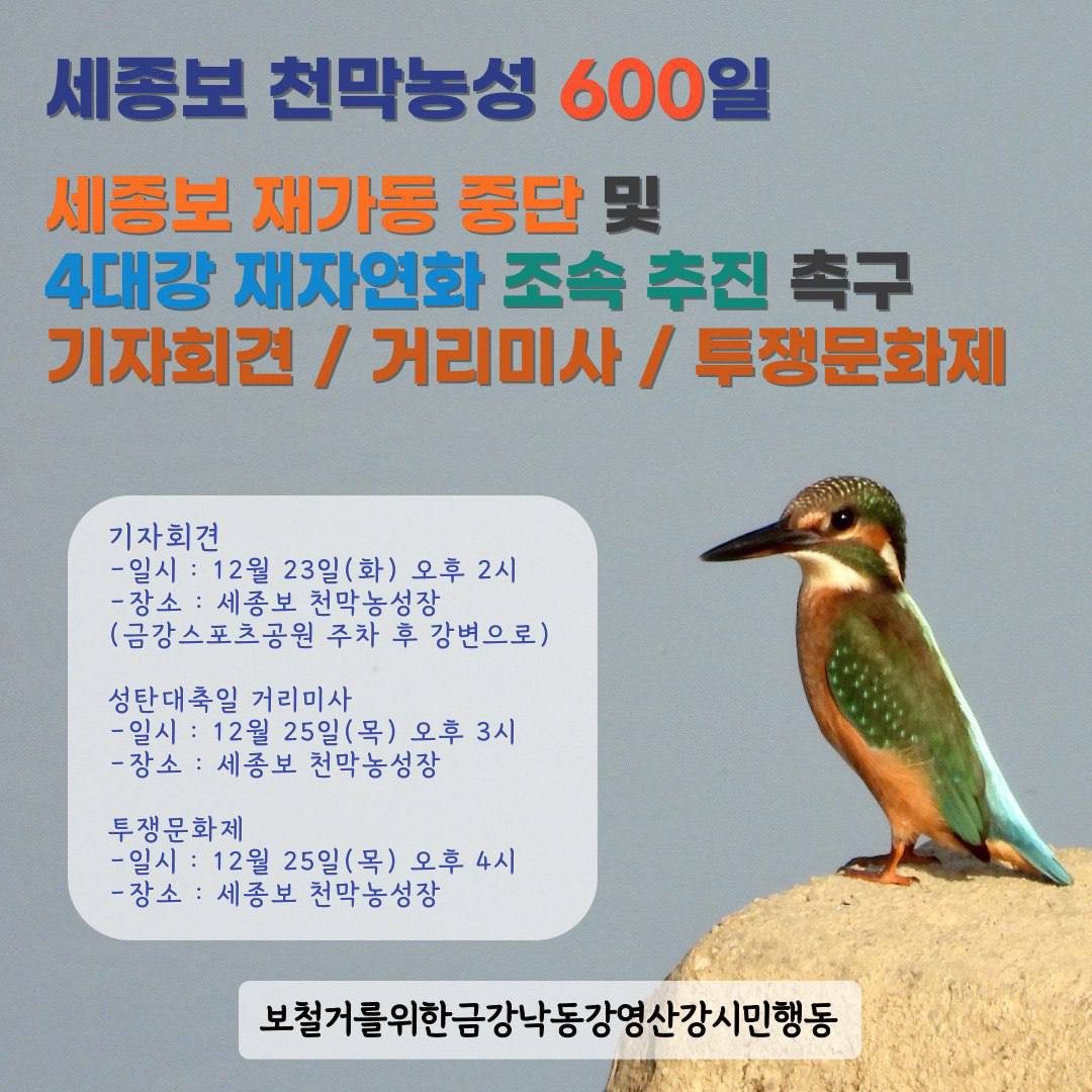 23일(화) 오후 2시, 농성장에서 600일 기자회견을 엽니다. 우리는 여전히 ‘강’합니다. 우리는 이재명 정부의 조속한 4대강 재자연화 정책 추진을 촉구합니다. 구체적인 대책을 마련하고 확정하여 추진하도록 우리는 계속 투쟁합니다. 그리고 오는 크리스마스 오후 3시에는 농성장에서 성탄미사가 봉헌됩니다. 600일 동안 성심으로 금강을 모셔주신 신자동지들께 감사합니다. 미사를 마치고 4시부터는 투쟁 문화제를 진행합니다. 지금 이 시대, 전쟁에 농성에 투쟁에 아픔의 현장들이 너무 많아 예수는 어디로 가야 하나 마음이 분주할 테지요. 아, 예수야 여기에도 있고 저기에도 있겠지마는, 단언컨대 여기는 들렀다 가실 겁니다. 오세요. 빈 자리 있습니다.