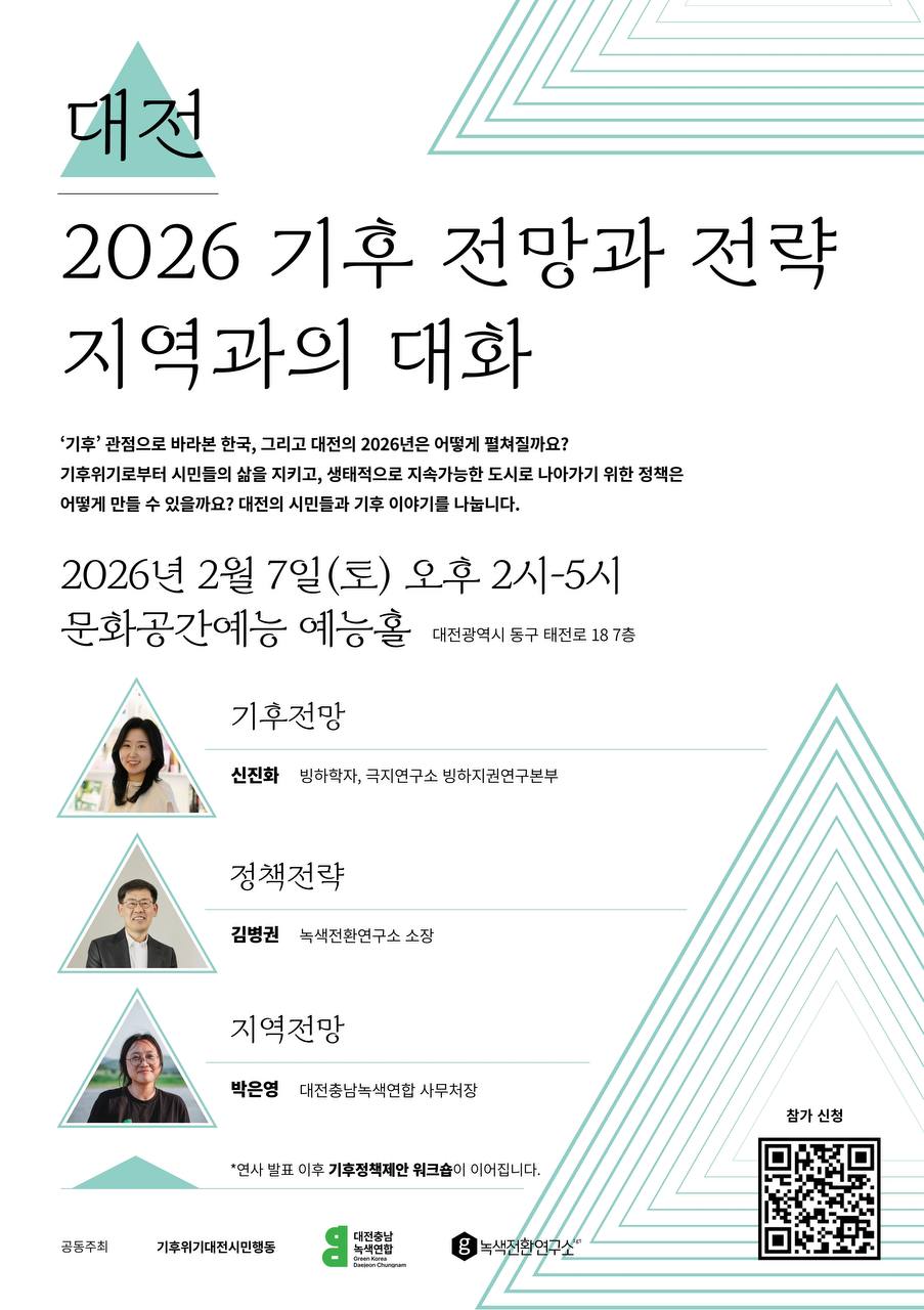 ‘기후’ 관점으로 바라본 한국, 그리고 대전의 2026년은 어떻게 펼쳐질까요? 기후위기로부터 시민의 삶을 지키고, 생태적으로 지속가능한 도시로 나아가기 위한 정책을 함께 고민하는 자리에 여러분을 초대합니다. 많은 관심과 참여 부탁드립니다.