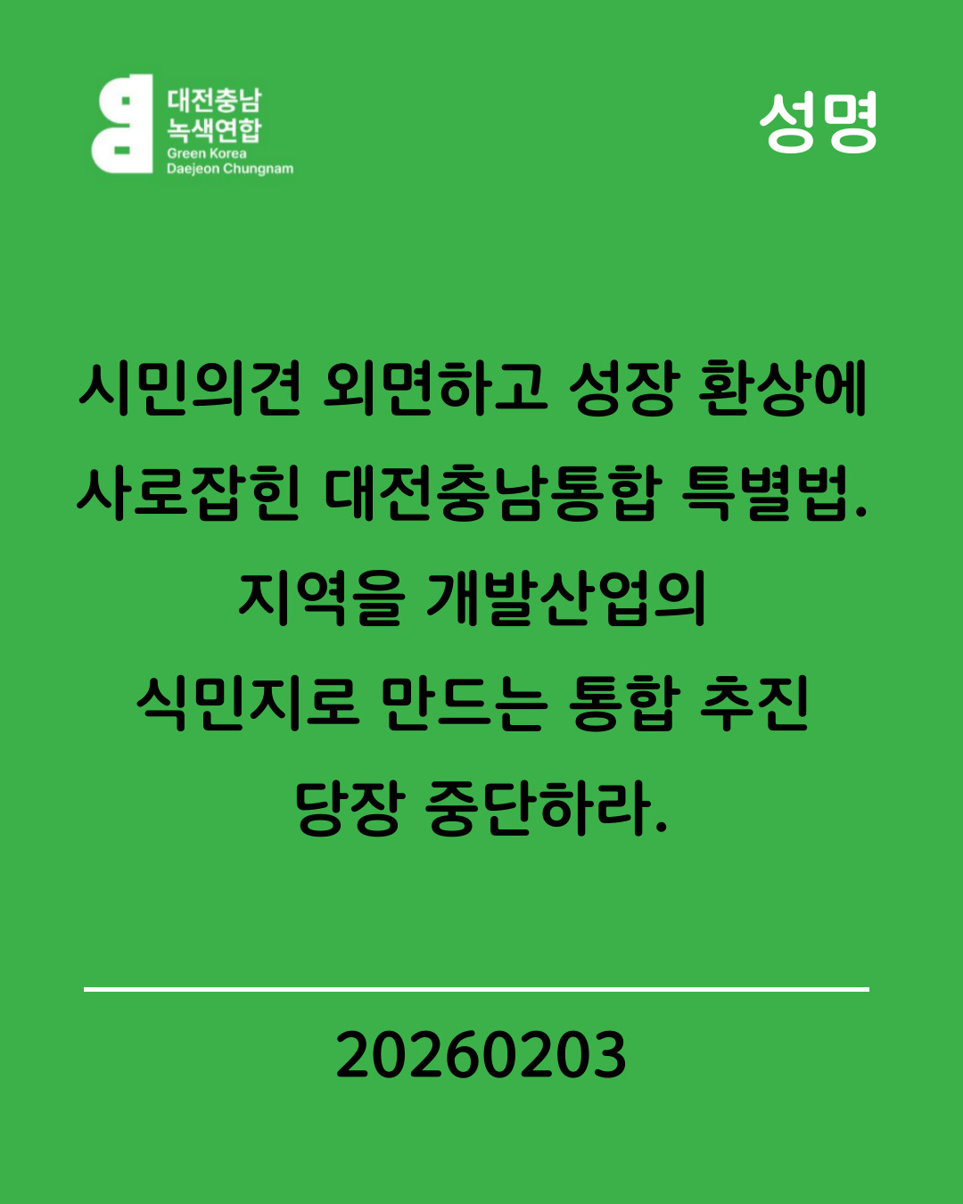 무엇보다 중요한 것은 이 논의 과정에 정치권의 목소리만 있을 뿐, 대전시민들의 목소리는 뒷전이라는 점이다. 중단을 요구하는 시민사회의 목소리를 외면한 채 정치적 목적에 의해 추진되는 통합은 당장 중단되어야 한다. 지금이라도 대전시민들과 충남도민들이 직접 판단할 수 있도록 충분한 숙의 공론화 과정을 진행하라. 대전충남녹색연합은 대전과 충남의 자연환경이 개발이라는 정치욕망에 망가지지 않도록 전력을 다해 투쟁할 것이다.