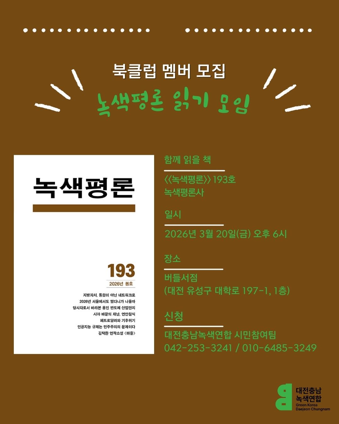 ✔️참가 신청 : 대전충남녹색연합 시민참여팀 010-6485-3249로 신청자 이름/녹색평론 읽기 모임 참가 보내기!