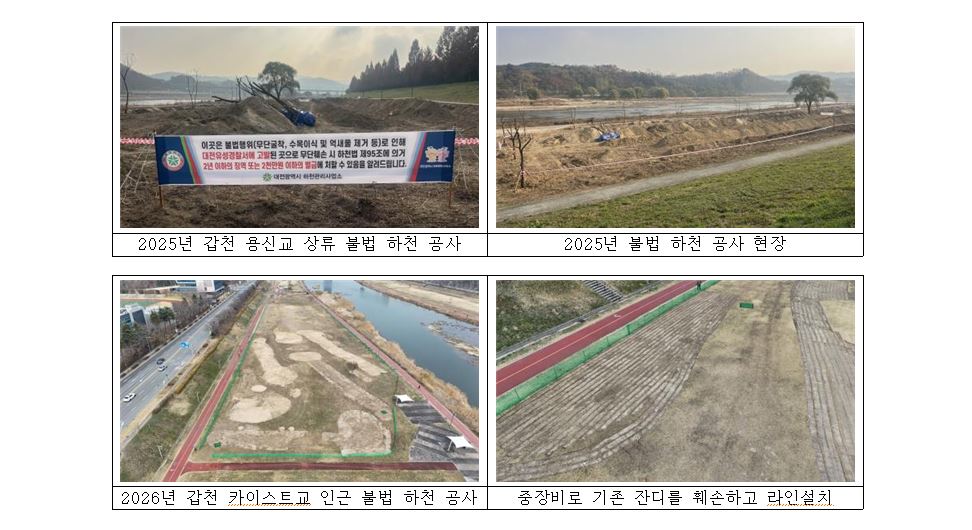 유성파크골프협회는 작년 11월 갑천 용신교 상류 멸종위기 야생생물 맹꽁이 서식지인 억새밭에 무단으로 중장비를 투입해 불법 조성 공사를 진행했다. 대전하천관리사업소는 유성파크골프협회를 고발하고 현재 해당 부지는 원상복구 절차를 진행하고 있다. 이후 채 반년도 지나지 않아, 하천 불법 공사가 또다시 강행됐다.
