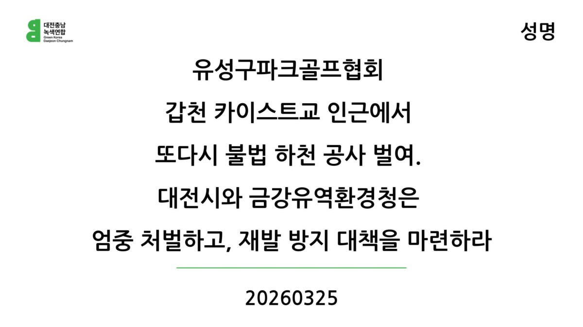 다수 시민들이 이용하는 산책로 등을 포함한 하천부지에서 민간에서 임의로 불법 공사를 강행했다는 것은, 관리 부처의 하천 관리에 큰 허점이 있음을 증명한다. 하천 관리 주체인 대전시와 금강유역환경청의 안일한 대응이 불법 행위의 반복을 부추기고 있는 꼴이다. 대전충남녹색연합은 대전시와 유성구, 금강유역환경청이 이번 불법 하천 공사에 대해 엄중하게 대응하고, 재발 방지 대책 마련을 강력히 촉구한다. 또한, 파크골프 이용 현황 등을 전수조사하고 불법 행위가 또다시 반복되지 않도록 동호인들의 인식을 개선하고, 파크골프장 등 특정 시설의 설치에 대한 시민 의견을 적극 수렴하는 등의 대책을 마련해야 할 것이다. 반복된 불법 행위에 대해 엄중한 대책이 이뤄지지 않는다면 우리는 대전시와 금강유역환경청의 명백한 태업으로 규정하고 대응해 나갈 것을 경고한다.