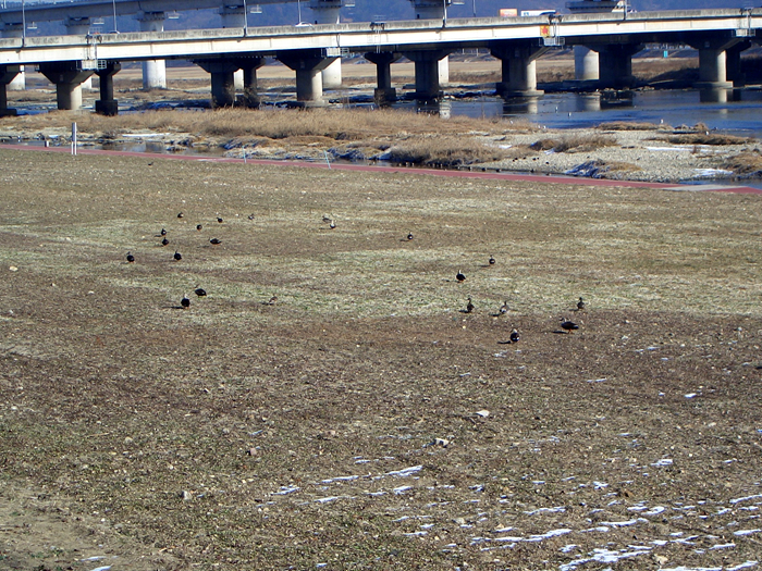 탑립에서 용산교 구간의 잔디둔치에 잔디씨를 주워먹고 있는 흰뺨검둥오리들