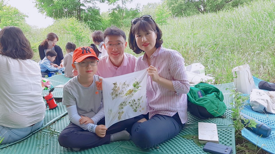 완성된 풀잎 손수건을 들고 환하게 웃고 있는 가족들의 모습과