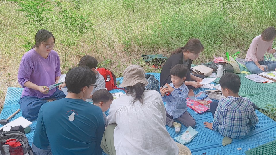 장소에 도착한 가족들이 편안하게 앉아 참나무류의 재밌는 이야기를 듣고 있어요.